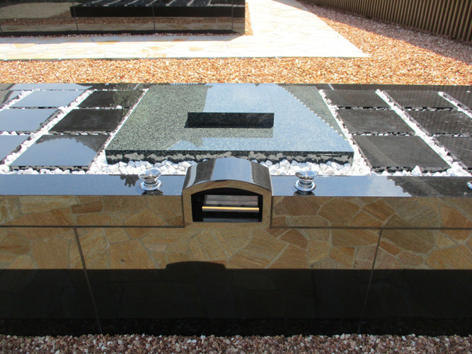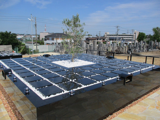 明るい雰囲気の外構、通路を設計しました。樹木葬個別区画本体は黒を基調とした落ち着いたデザインです。
